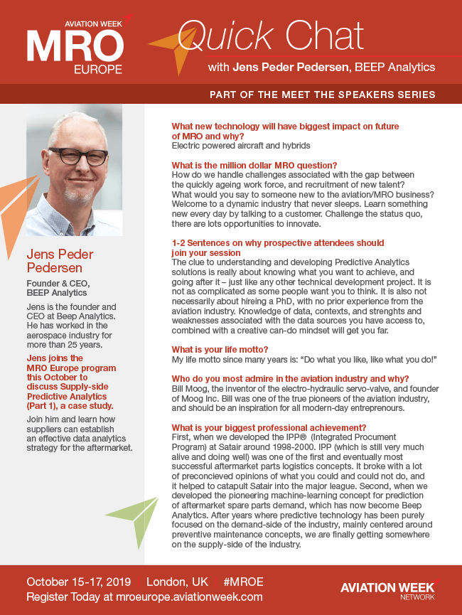 Jens Peder Pedersen, CEO of Beep Analytics, will join the MRO Europe program with on 16th Oct 11:15 AM - 12:00 PM to discuss Supply-side Predictive Analytics. Join him in Excel London and learn how suppliers can establish an effective data analytics strategy for the aftermarket. Read more about the case study.